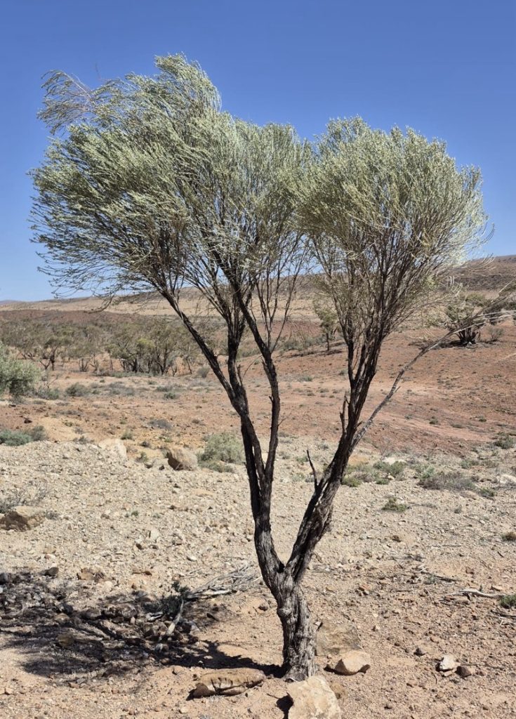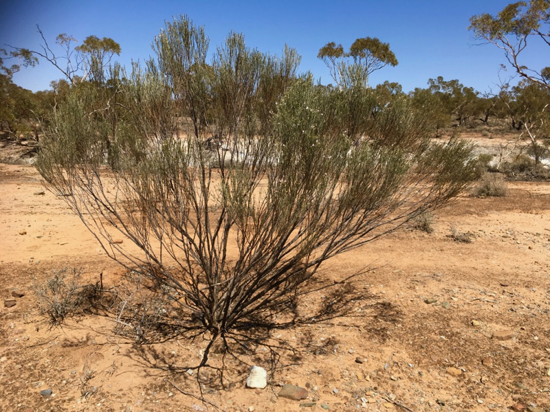 Eremophila scoparia, the Broombush, in Leigh Creek, presenting as multi-stemmed, 1.5m tall.