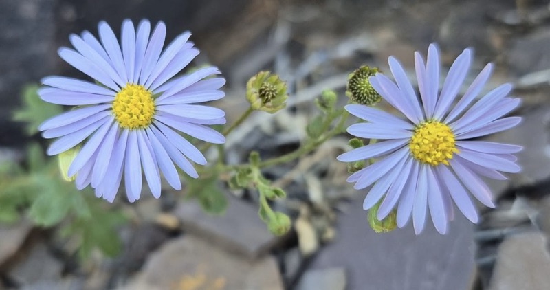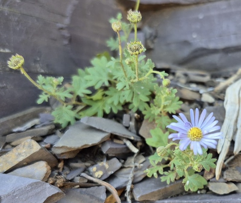 The Purple Burr-daisy (Calotis cuneifolia) is uncommon in South Australia, local to the flood plains of the Murray River flood plains. It was seen flowering among the shales of Chambers Gorge in the North Flinders Ranges, South Australia, in November.