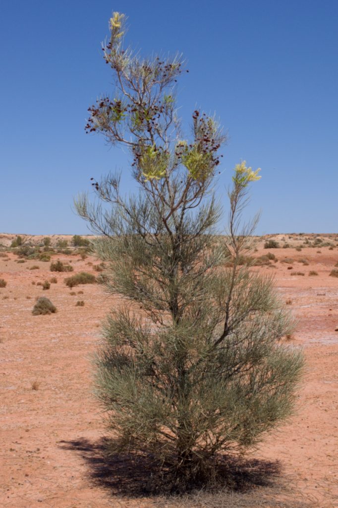 Grevillea nematophylla ssp. nematophylla, known as Water Bush, is a rare sight in the Flinders Ranges. This solitary tree between Copley and Lyndhurst was flowering in November.