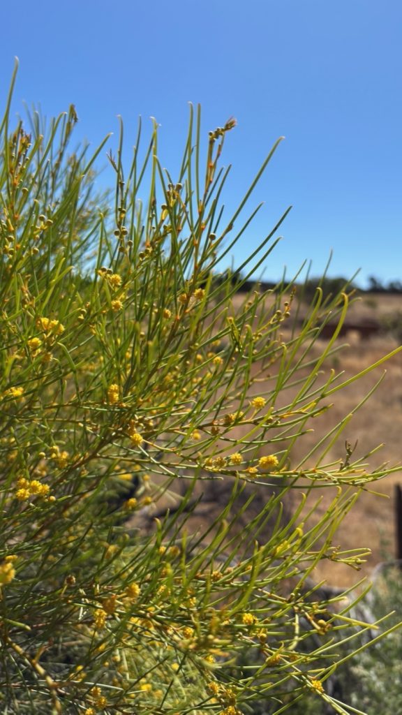 The semi-parasitic Jointed Cherry, Exocarpus aphyllus, flowering on the Copley Commons in November. Flowers approximately 2mm. Host to Case Moth larvae.