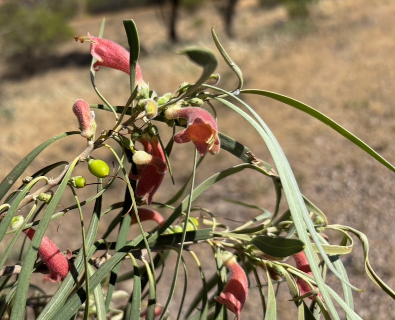Eremophila longifolia, distinguished by its drooping strappy leaves, seen flowering near Carrieton in November.
