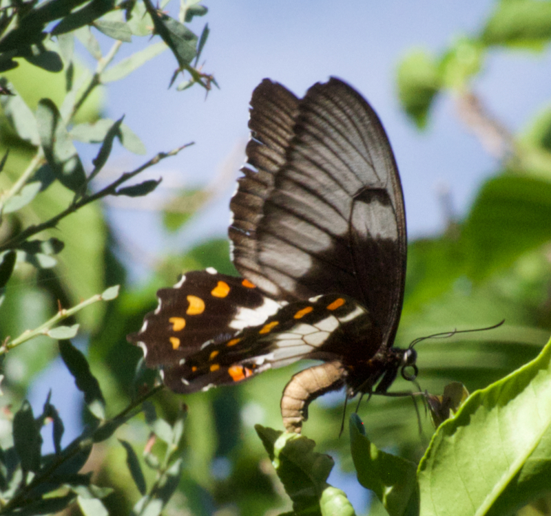 Female Orchard Swallowtail Butterfly (Papilio aegeus aegeus) seen around citrus plants which are host plants to caterpillars, in Copley, Northern Flinders Ranges.