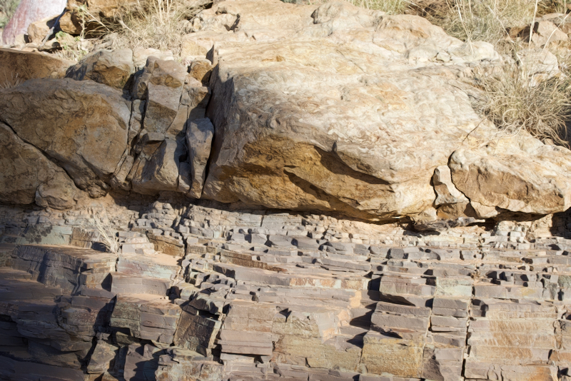 A geological unconformity is an unconformable contact between two different lithologies. In the case of this formation in Jubilee Creek in the Northern Flinders Ranges, stromatolitic limestone of the Balcanoona Formation overlays laminated mudstone of the Tapley Hill Formation.