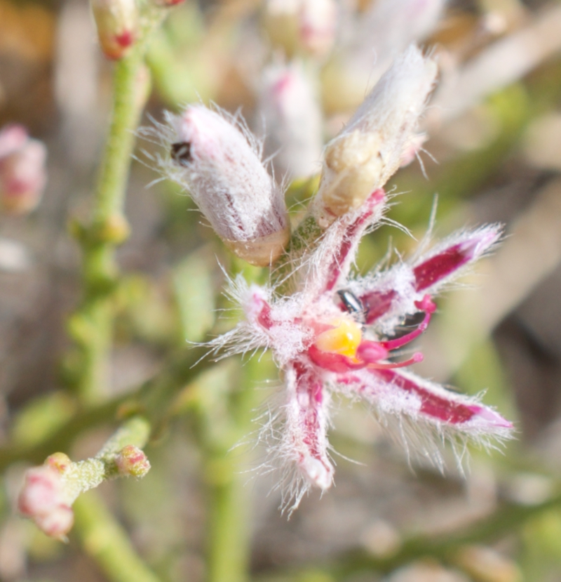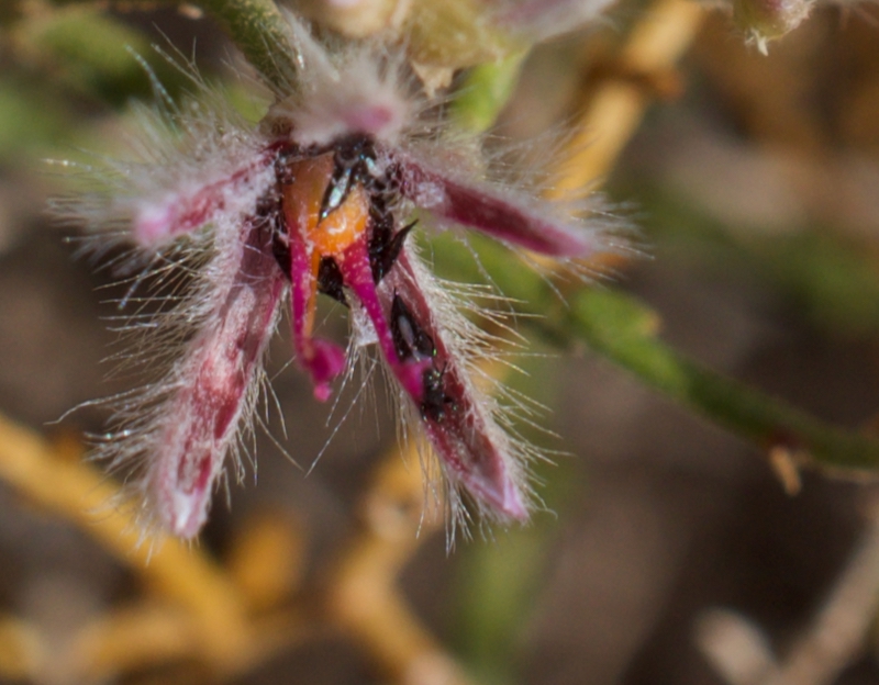 The Gammon Ranges Fox-tail (Ptilotus propinquus) is said to be endemic to South Australia, rare, and “found in a small area in the Gammon Ranges, growing on bare shaly clay soil, on ironstone hills, gypseous breakaways or rocky gullies, with Casuarina over chenopods, or with scattered mallees“. It prefers breakaway and mesa plateau areas, and grows around Balacoona, Lake Frome and Moro Gorge.