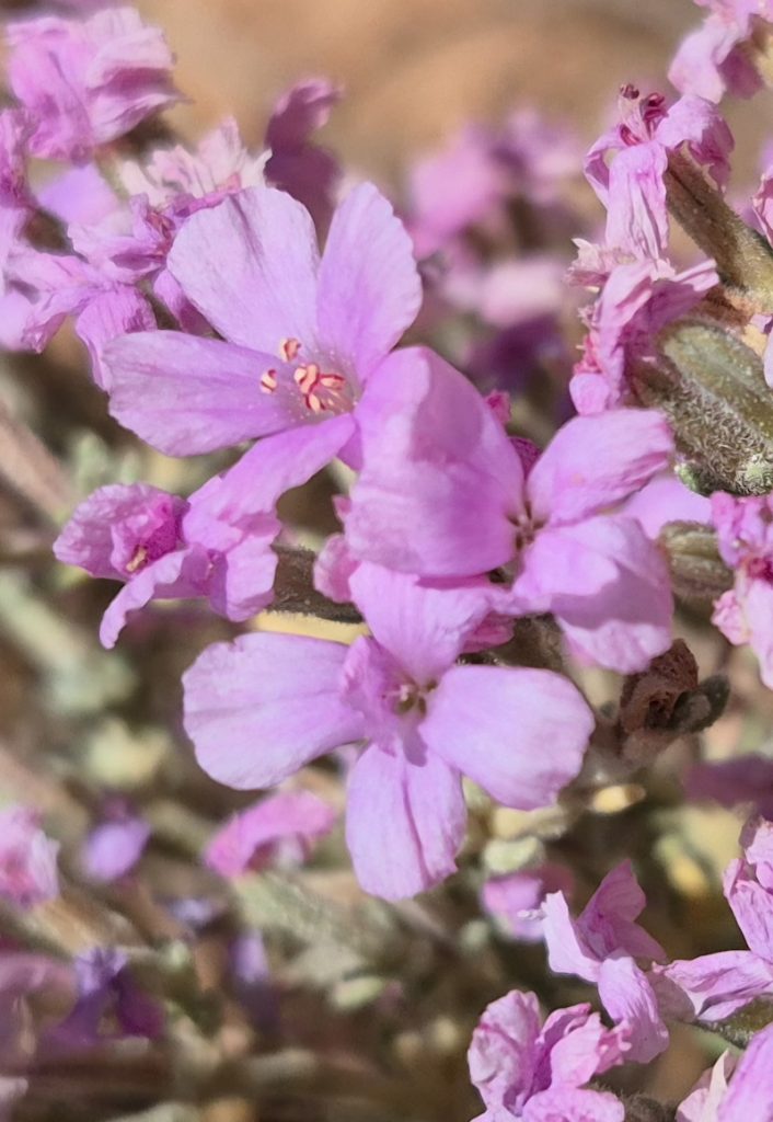 Halgania cyanea, known as Rough Halgania, is a small sub-shrub that is widely distributed throughout Australian arid lands, and is also adaptable to temperate climates. A variable species, its growth habit at Crystal Brook in the Flinders Ranges is small and sparse (up to 25cm), with flowers (>10mm) with slightly rounded petals in early spring.