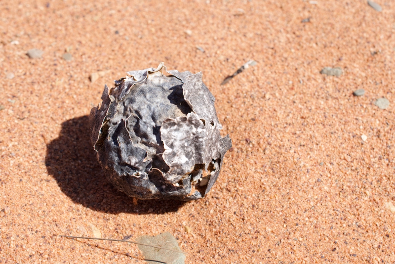 Also commonly known as Paddy Melon, Camel Melon (Citrullus amarus) was introduced to South Australia with camels in the 19th century. Though related to squash, gourds and melons, Camel Melon is not generally eaten. The fruit (approximately 8cm wide), dries into a resilient seed casing, leading to a proliferation of this plant in various harsh outback conditions, including sand dunes.