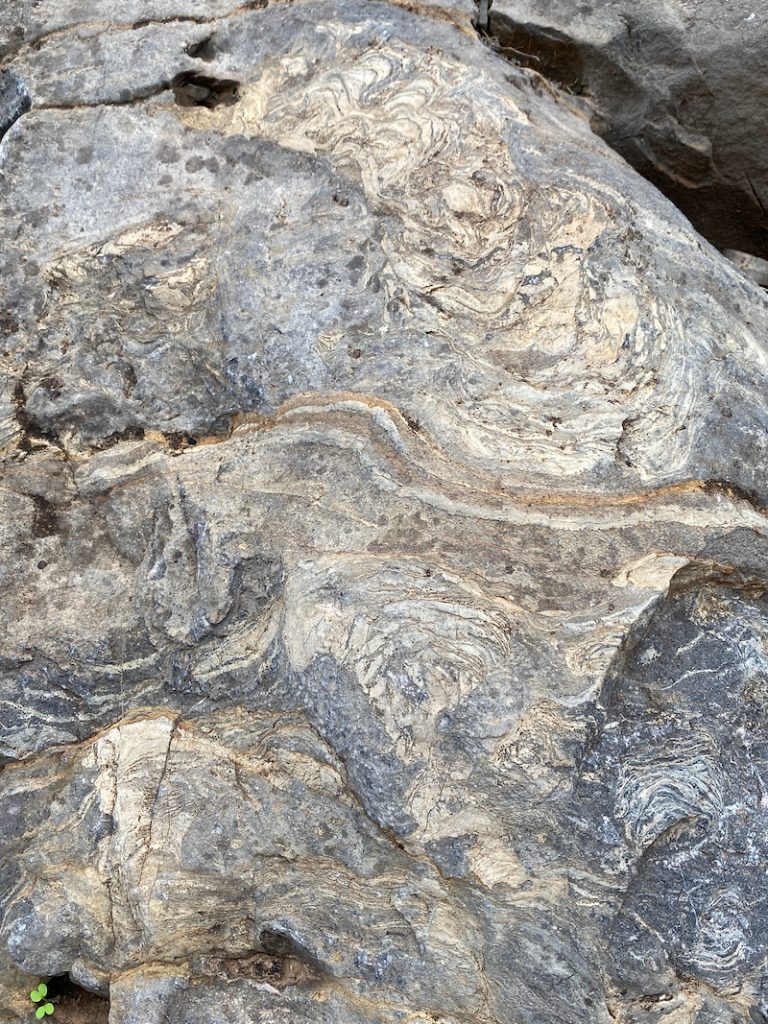 These two formations followed the melting of an ice age dating 700 million years ago. “Black silt, rich in fine organic material derived from algae and bacteria, was deposited as laminations (each less that 0.5mm thick) in the calm shelf sea. The total thickness of this silt blanket (known as the Tapley Hill Formation) increased from a few tens of metres in the west to about 3km in the ranges east of Hawker. Here depth of water and rate of subsidence of the basin floor were greatest. As silt built up, the water around the margins of the basin became shallow enough for stromatolites and oolite banks to form; these are exposed near Port Augusta and Balcanoona [Balcanoona Formation].” – Excerpt from The Legacy of Time: The Story of the Flinders Rangesby the Royal Geographical Society of South Australia.