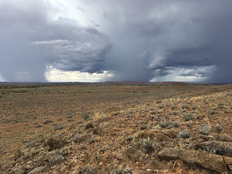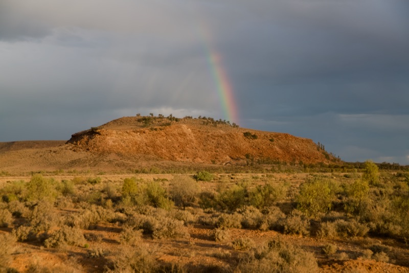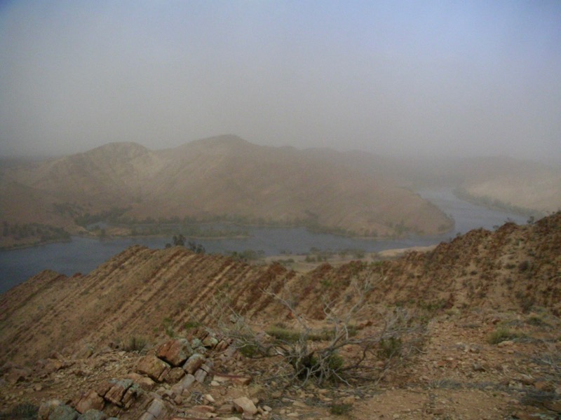 Aroona Dam, contained by the precambrian Copley Quartzite formation, during a dust storm.
